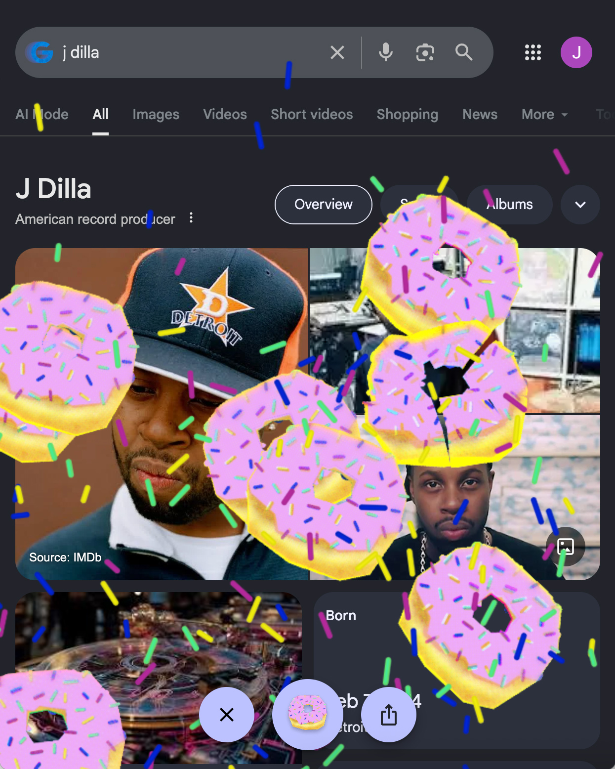 For Dilla's birthday, February 7th, they honored the producer with animated clip with the track "Waves," and donuts confetti that appeared when Google users searched J Dilla.